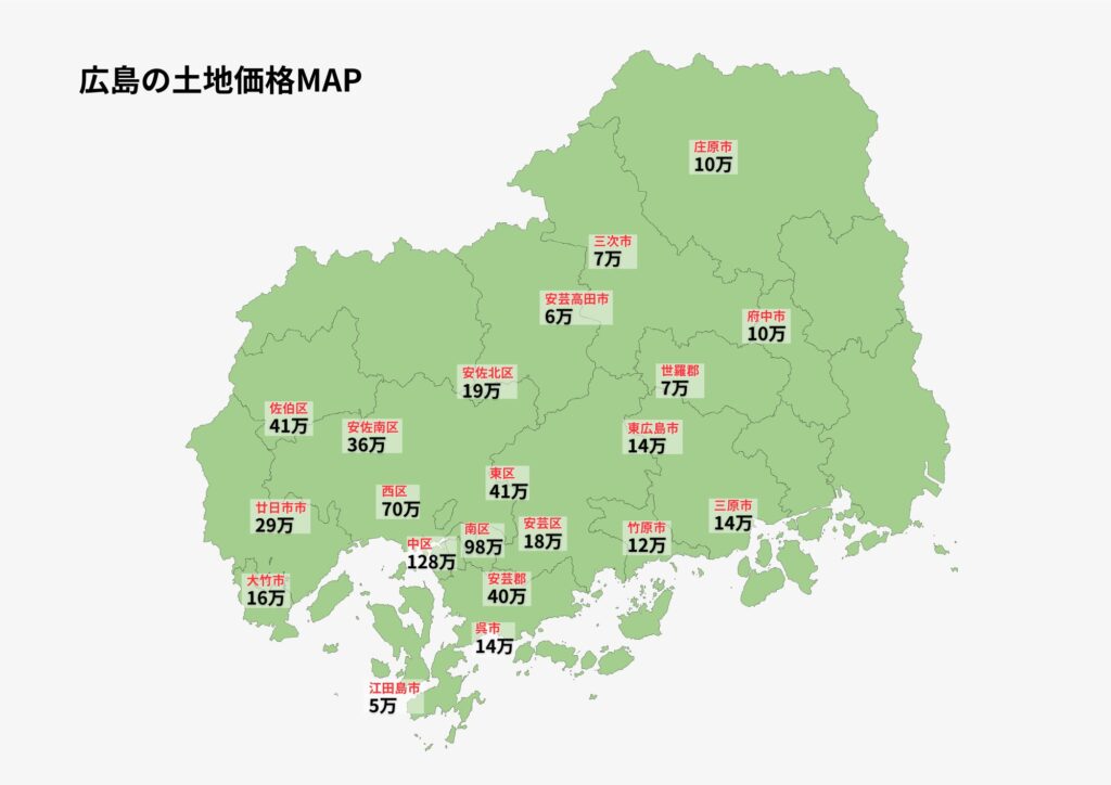 | 佐伯区・安佐北区 | 30~45万円/坪 | 約1,200~1,800万円 |
